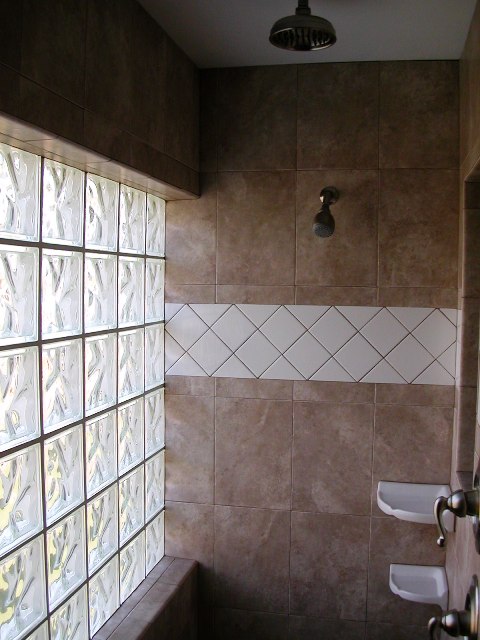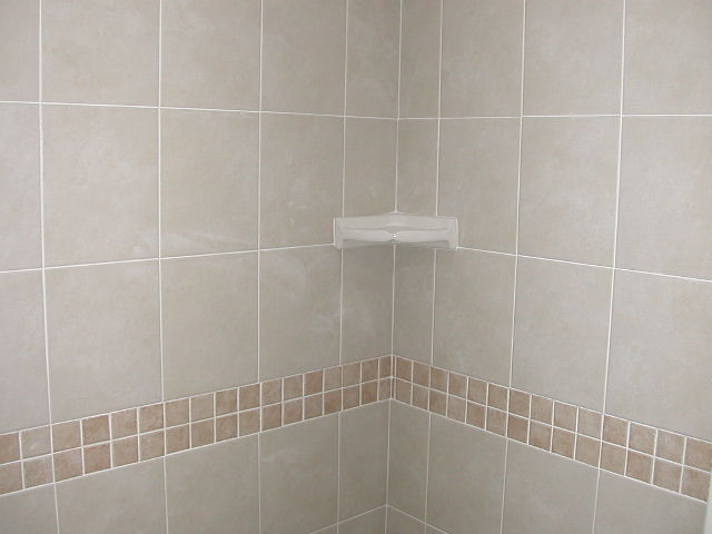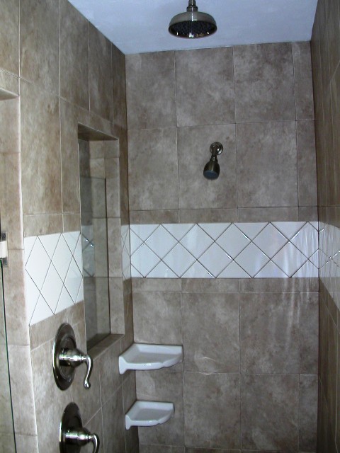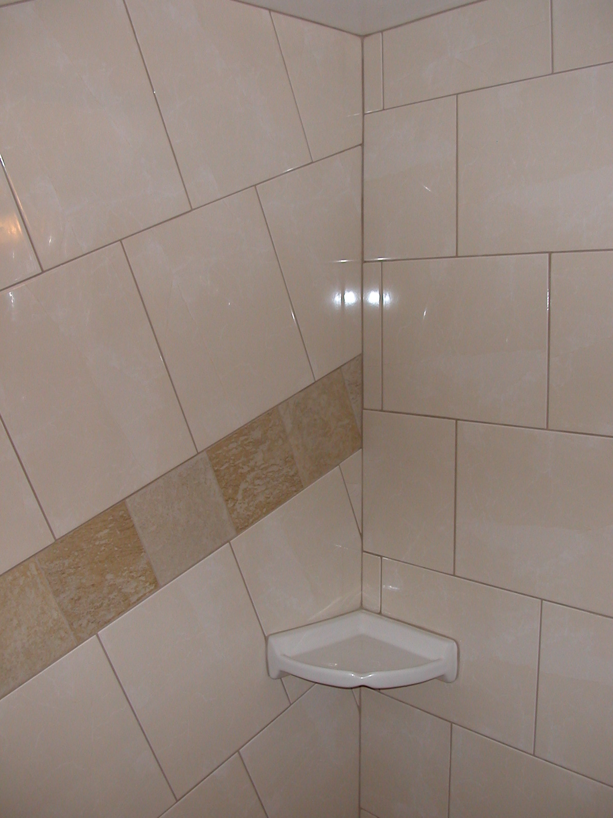 We used 6x8 porcelain wall tile with two different accent bands in this condo. The owner chose granite counter tops and white fixtures for a very contemporary look. CLICK on pictures to enlarge. |