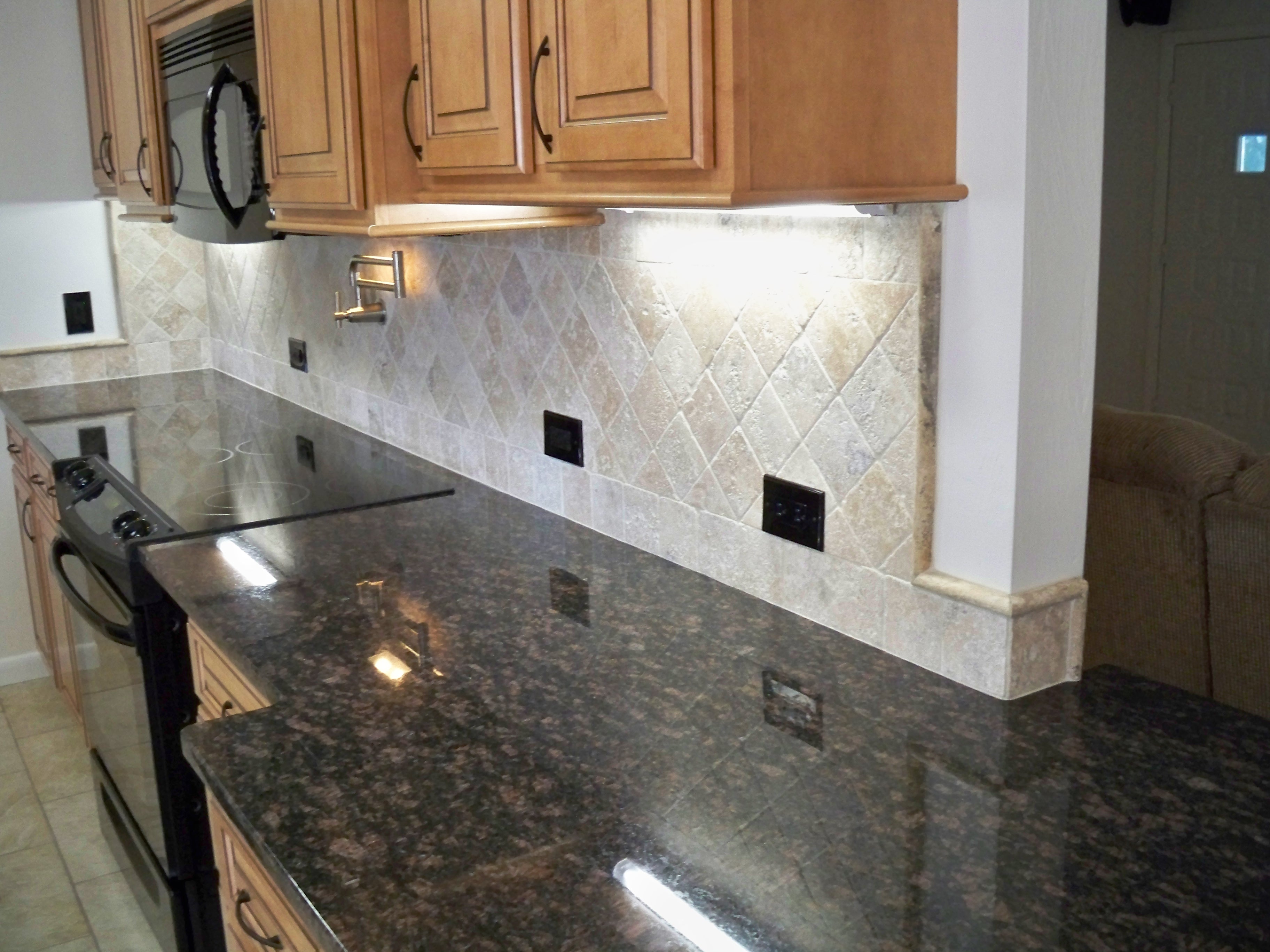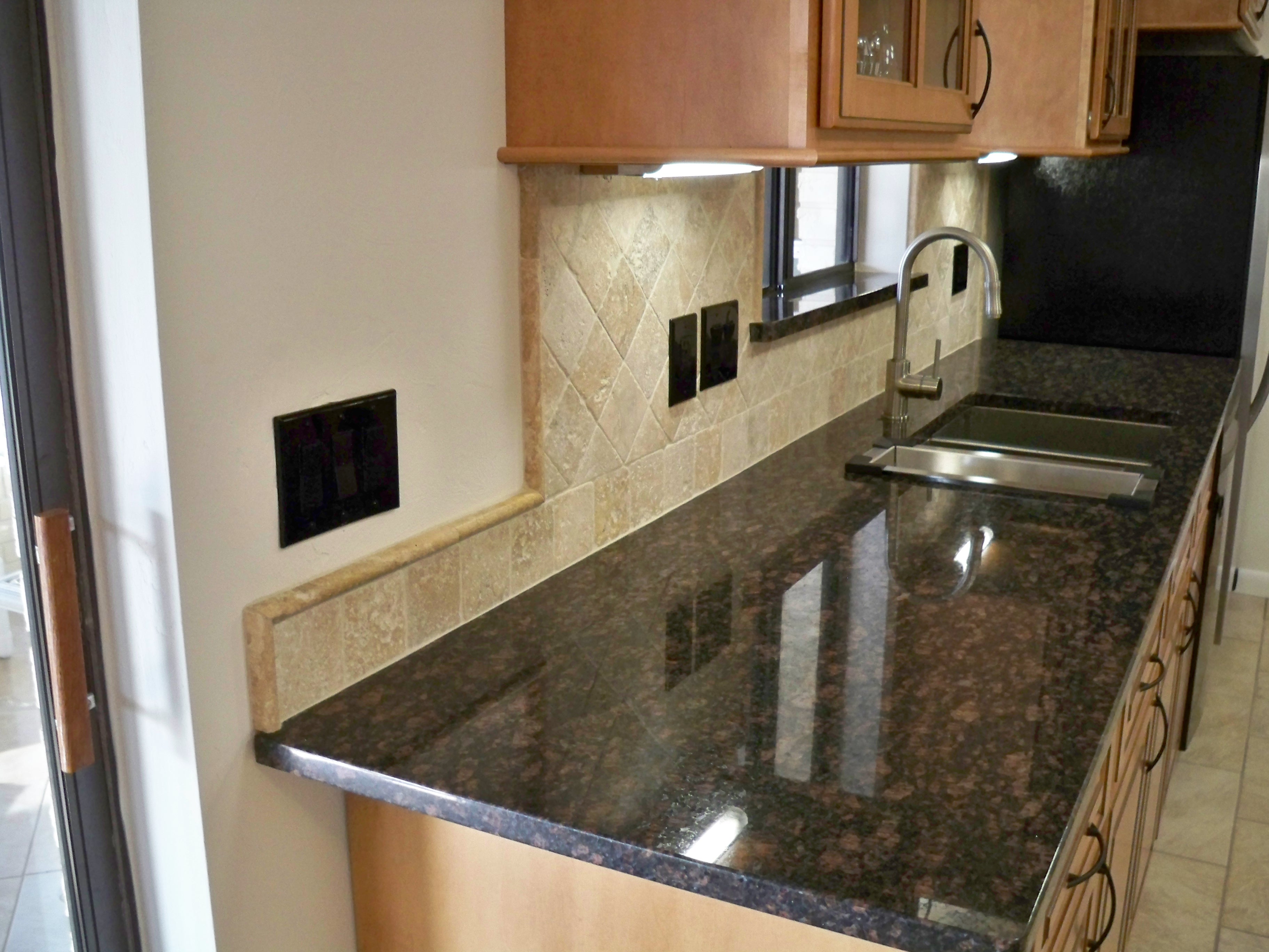 | Maple cabinetry with chocolate glaze and Baltic Brown granite. Travertine back splash installed both diagonal and straight. Porcelain tile flooring. |