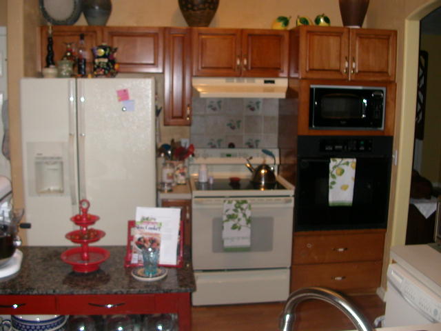 | Yes, it's the same kitchen! Here is what we did: 1) We moved the oven wall 8 feet out into the garage 2) We removed a wall that was between the kitchen and dining area 3) We removed the dropped ceiling 4) We replaced the old kitchen window with a impact hurricane rated window 5) We removed the old tile and replaced it with 18" installed on the diagonal 6) We installed new lighting and upgraded the electrical service to the kitchen 7) We plastered the new ceiling and walls 8) We designed new cabinetry along with the owner 9) and we finished it off with Venetian Gold granite! This is one fabulous kitchen! We nearly tripled the useable square footage. |