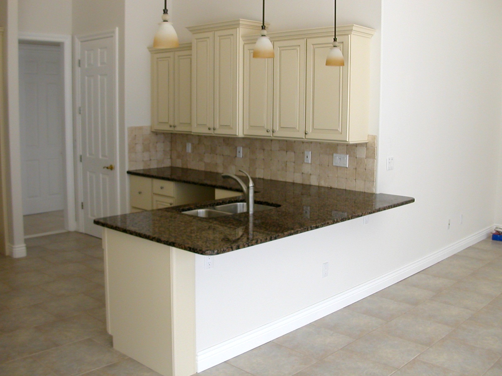 | Soft Maple cabinetry painted Ivory with Pewter glaze and Baltic Brown granite. Travertine back splash. Porcelain tile flooring installed with a semi-bond pattern. |